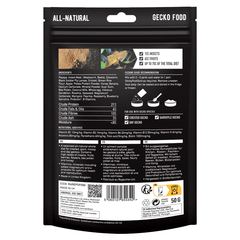 Arcadia EarthPro StickyFoot Gold ist ein hochwertiges, sorgfältig entwickeltes Alleinfuttermittel, das speziell auf die Bedürfnisse von Fruchtfressern und Allesfressern wie Käfer, Taggeckos, Kronengeckos, Anolis und anderen kletternden Reptilien abgestimmt ist. Die Rezeptur basiert auf natürlichen Zutaten und verzichtet vollständig auf künstliche Aromen, Farbstoffe und minderwertige Füllstoffe.