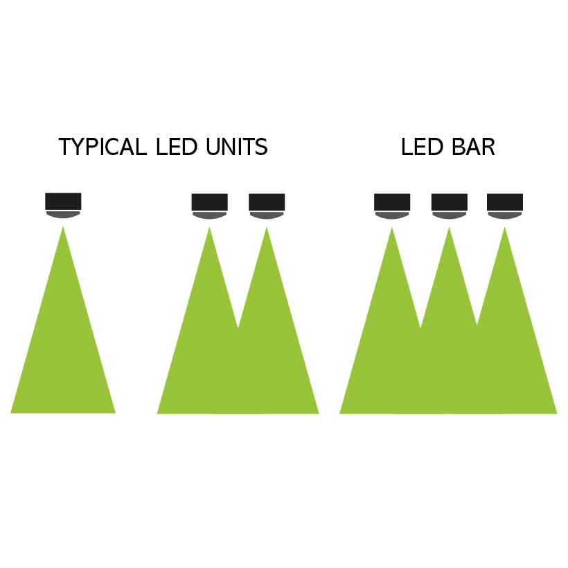 Die Konfiguration der LEDs in einer Lampe ist für das potenzielle Pflanzenwachstum und die beleuchtete Fläche ebenso wichtig wie ihr Spektrum und ihre Leistung. Wie alles Leben sind auch Pflanzen auf die Menge und Qualität der Energie angewiesen, die ihnen über eine Lichtquelle zur Verfügung steht. Je größer die Lichtmenge und je größer die beleuchtete Fläche, desto besser sind die möglichen Ergebnisse. Eine beliebige Lichtquelle kann nur eine bestimmte Anzahl von Photonen (Energiepakete) als „Gesamtlichtleistung“ erzeugen. Wenn sich das Licht vorwärts bewegt, beginnt es sich auszubreiten, um einen größeren Bereich abzudecken. Je weiter eine Lampe entfernt ist, desto größer ist der Bereich, der mit Licht abgedeckt wird. Die gemessene Energie im Licht wird jedoch schwächer, je weiter die Lampe vom Ziel entfernt ist. Um sicherzustellen, dass die größtmögliche Lichtmenge in ein Gehäuse eintritt, müssen genügend Dioden verwendet werden, die im richtigen Abstand zueinander und mit einem geeigneten Spektrum, einer geeigneten Farbe und einem geeigneten Lumenausstoß angeordnet sind.