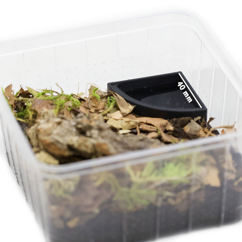 Die Insektenliebe Eckschale wurde speziell für Terrarien entwickelt, in denen jeder Zentimeter zählt. Durch ihre präzise 3D-gedruckte Form nutzt sie Ecken optimal aus und schafft eine stabile, hygienische Wasser- oder Futterstelle. Du kannst sie in drei Größen wählen – 30 mm, 40 mm oder 60 mm Schenkellänge – und damit perfekt an die Größe deines Setups anpassen. Die Schale sitzt sicher in der Terrarienecke und lässt sich problemlos entfernen oder reinigen.