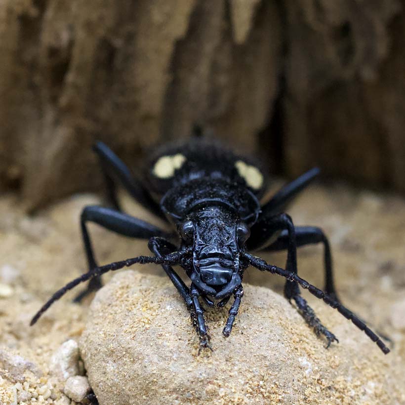 This impressive beetle originates from the dry savannahs of West and Central Africa. There it lives on sandy soils with sparse vegetation. In the terrarium, it therefore feels particularly at home in a dry setup with a loose mixture of sand and clay. Flat stones, cork tubes and roots, which serve both as hiding places and climbing elements, are suitable furnishings. An area of at least 30 x 30 centimetres offers the beetle enough space to move around.